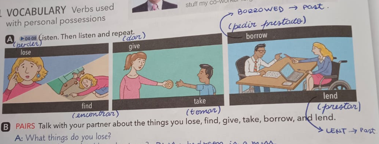EL uso de la traducción se da en cualquier nivel del aprendizaje de otro idioma ya sea de forma explícita o implícita[2]. Por ejemplo, mientras daba una clase de inglés a alumnos relativamente nuevos (4 meses de estudio). Algunos de ellos, aunque no hacen uso de la traducción mecánica (uso del Google translator), hacen uso de la traducción de frases (ver figura 2). Como se aprecia en el ejemplo (libro de una alumna que tiene 4 meses estudiando inglés) la alumna prefirió traducir las explicaciones de profesor en su idioma de origen, especialmente porque se tratan de verbos confusos en idioma como es el caso de los verbos “lend”, y “borrow”, que presen tan acepciones. El aprendiz de un segundo idioma (en este caso el inglés) no va a poder internalizar tal acepción a menos que se le explique en su propio idioma o haga uso de una “traducción de frase o palabra”[3]. No es ninguna novedad que los alumnos opten por estas técnicas de aprendizaje, y estoy convencido que muchos profesores de idiomas hacen lo mismo.