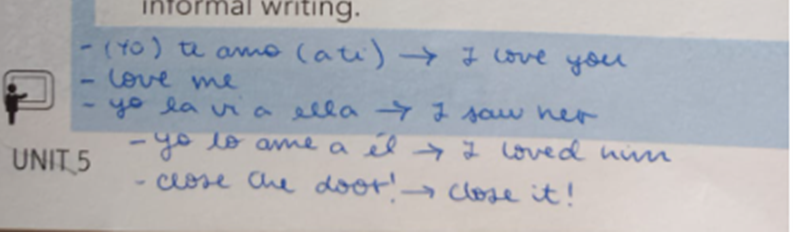De hecho, por muchos años este ha sido el enfoque. Existen innumerables estudios que lo sostienen, y es en gran manera cierto. Por ejemplo, en la edad media, el método de la enseñanza de idioma era el método gramatical que justamente se centraba en traducir oraciones de un idioma a otro ya que su enfoque era el saber un idioma (conocimiento, el qué), y además se impartía en los idiomas clásicos. Pero, hoy en día hay estudios (pocos, pero hay) que la traducción no solo puede usarse para fines de comparación gramatical sino también pueden extender a otras habilidades como speaking, Reading y writing[6], e incluso hay estudios que sostienen que la traducción podría considerarse como una habilidad más dentro de las clases ELF de pregrado[7] . Por tanto, el hecho de afirmar que la traducción es meramente una herramienta para el aprendizaje gramatical o comparación entre dos idiomas es desacreditar a los nuevos estudios, pero también a la evidencia descrita anteriormente, en la cual se puede observar que muchos alumnos la usan para su aprendizaje ya sea de forma explícita o implícita, e incluso para comprender nuevas ideas, conceptos que son difíciles[8]. Y esto no es nada nuevo. Usualmente los alumnos hacen uso de la traducción por las mismas razones, y no simplemente por una cuestión gramatical. Por ejemplo, en la siguiente figura se puede observar como esta alumna ha hecho uso de la traducción para entender un “concepto gramatical (objetos pronombres)”, “una estructura gramatical”, mas no enfocarse en la gramática como tal.